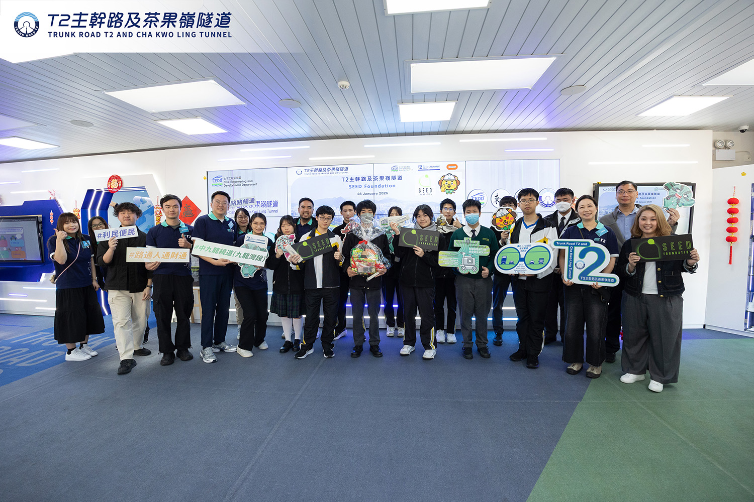 - 2025年6月25日及27日,致力推動本地青少年數碼科技培訓的慈善機構SEED Foundation分別帶領聖母玫瑰學校、德蘭中學及仁濟醫院王華湘中學學生,參與由T2主幹路及茶果嶺隧道項目團隊舉辦的「創新科技工作坊」。活動旨在介紹創新科技在基建項目中的應用,啟發學生投身創科及工程行業。團隊介紹項目背景及社會效益,並展示隧道鑽挖機操作及智能質量檢測系統在隧道結構監測的應用。工程團隊分享工作內容、資格要求及發展前景,助學生規劃職涯。活動另設多項互動環節,如虛擬實境(VR)、擴增實境(AR)遊戲及360°隧道沉浸體驗,加深學生對科技及工程的理解,為未來奠基。