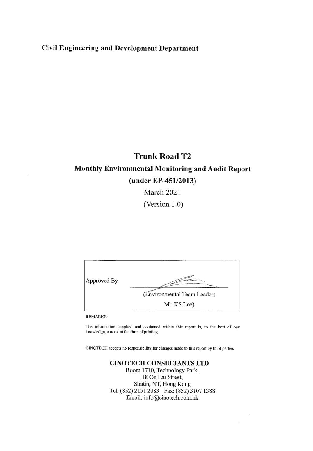 1. This is the 13th Environmental Monitoring and Audit (EM&A) Report prepared by the Environmental Team (ET), Cinotech Consultants Ltd., for “Trunk Road T2”. This report summarized the monitoring results and audits findings of the EM&A programme under the issued Environmental Permit (EP) No. EP-451/2013 and in accordance with the EM&A Manual (AEIAR-174/2013) during the reporting month of March 2021.
