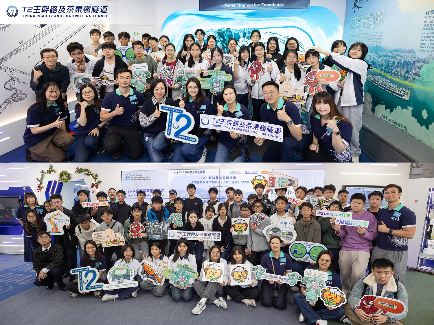 - 2025年6月25日及27日,致力推動本地青少年數碼科技培訓的慈善機構SEED Foundation分別帶領聖母玫瑰學校、德蘭中學及仁濟醫院王華湘中學學生,參與由T2主幹路及茶果嶺隧道項目團隊舉辦的「創新科技工作坊」。活動旨在介紹創新科技在基建項目中的應用,啟發學生投身創科及工程行業。團隊介紹項目背景及社會效益,並展示隧道鑽挖機操作及智能質量檢測系統在隧道結構監測的應用。工程團隊分享工作內容、資格要求及發展前景,助學生規劃職涯。活動另設多項互動環節,如虛擬實境(VR)、擴增實境(AR)遊戲及360°隧道沉浸體驗,加深學生對科技及工程的理解,為未來奠基。