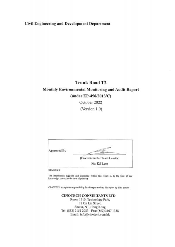Environmental Team (ET), Cinotech Consultants Ltd., for Contract No. ED/2018/04 “Trunk Road T2 and Infrastructure Works for